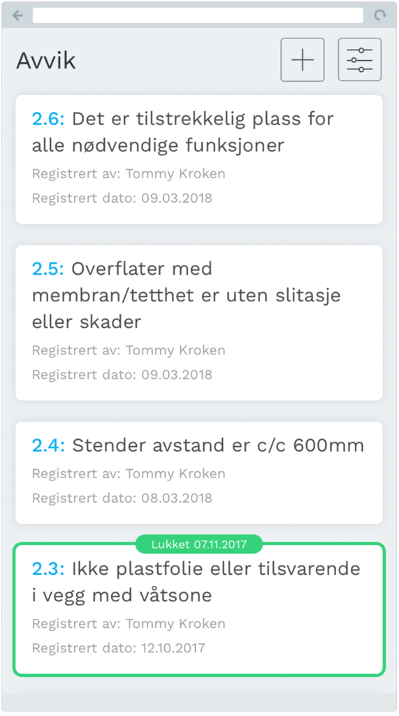 Alle avvik som registreres enten via. et sjekkpunkt eller på “vanlig” måte havner i avviksregisteret som det har gjort tidligere. Her kan du filtrere på status på avviket, om de er åpen eller lukket og den tidsperioden du ønsker å se.