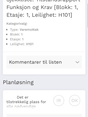 Her har vi laget en “snap-to” funksjon som betyr at hver gang du trykker “IR” eller “OK” så hopper systemet ned til neste sjekkpunkt. På denne måten går enkle sjekklister kjapt å gjennomgå dersom de ikke skal inneholde bilder eller kommentarer.