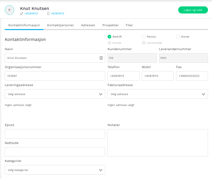 - Velge om en kontakt-type er en bedrift, person eller annet